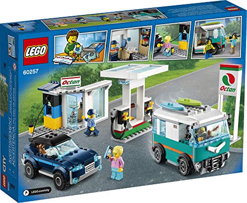 - This multi-model LEGO® City playset comes with a toy service station for electric and gasoline-powered vehicles, plus fun characters and a pet chihuahua!