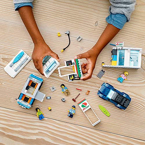 - Comes with everything a kid needs for action-packed, independent play, including a service station with shop, Octan E charging point and gas pump, an SUV, a camper van with surfboards, 4 minifigures, and a chihuahua dog figure.
