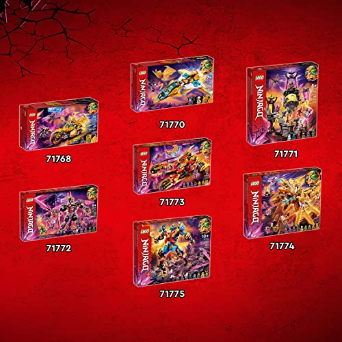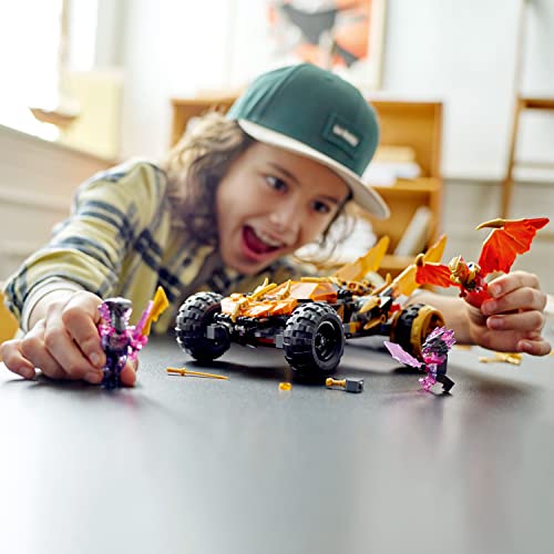 Details: LEGO® NINJAGO Cole’s Dragon Cruiser (71769) building Set lets kids aged 8+ stage fun-filled scenes from the NINJAGO: Crystallized TV series. The ninja vehicle features impressive golden lightning blades that can be pushed forward into dragon attack mode, 4 large tires and a passenger and driver seat to place minifigures. This NINJAGO vehicle building set includes 4 minifigures: Golden Dragon Kai, with his pair of golden dragon wings adorned with spikes; Golden Cole; the serpentine General Aspheera, armed with a sword. NINJAGO toys transport kids into a thrilling world of fantasy action where they can team up with Cole, Kai, Nya and all the ninja crew to face down a cast of dangerous villains and play out adventures with an extensive collection of playsets including mechs, cars, dragons and temples.