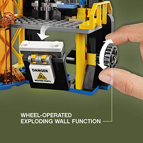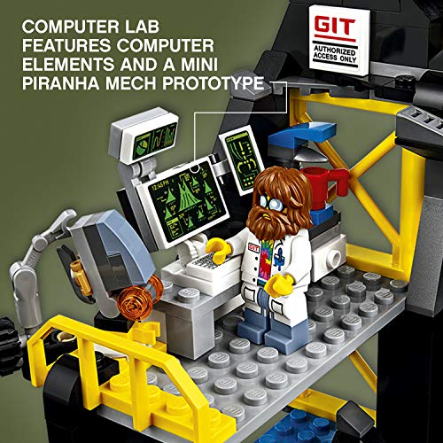 - Garmadon’s Volcano Lair features an entrance shaped like Garmadon’s face, Garmadon’s throne room, computer lab, construction zone, drone launchpad, orange lava elements and blue water-style