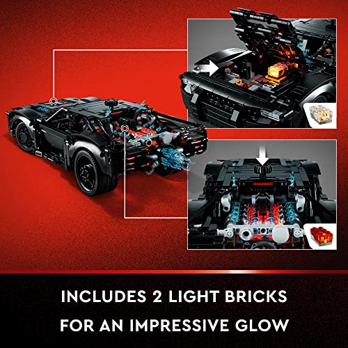 • See the car light up – Includes 2 light bricks to bring the BATMOBILE to life. The red light adds a glow to the transparent engine, while the yellow brick lights up the front grille